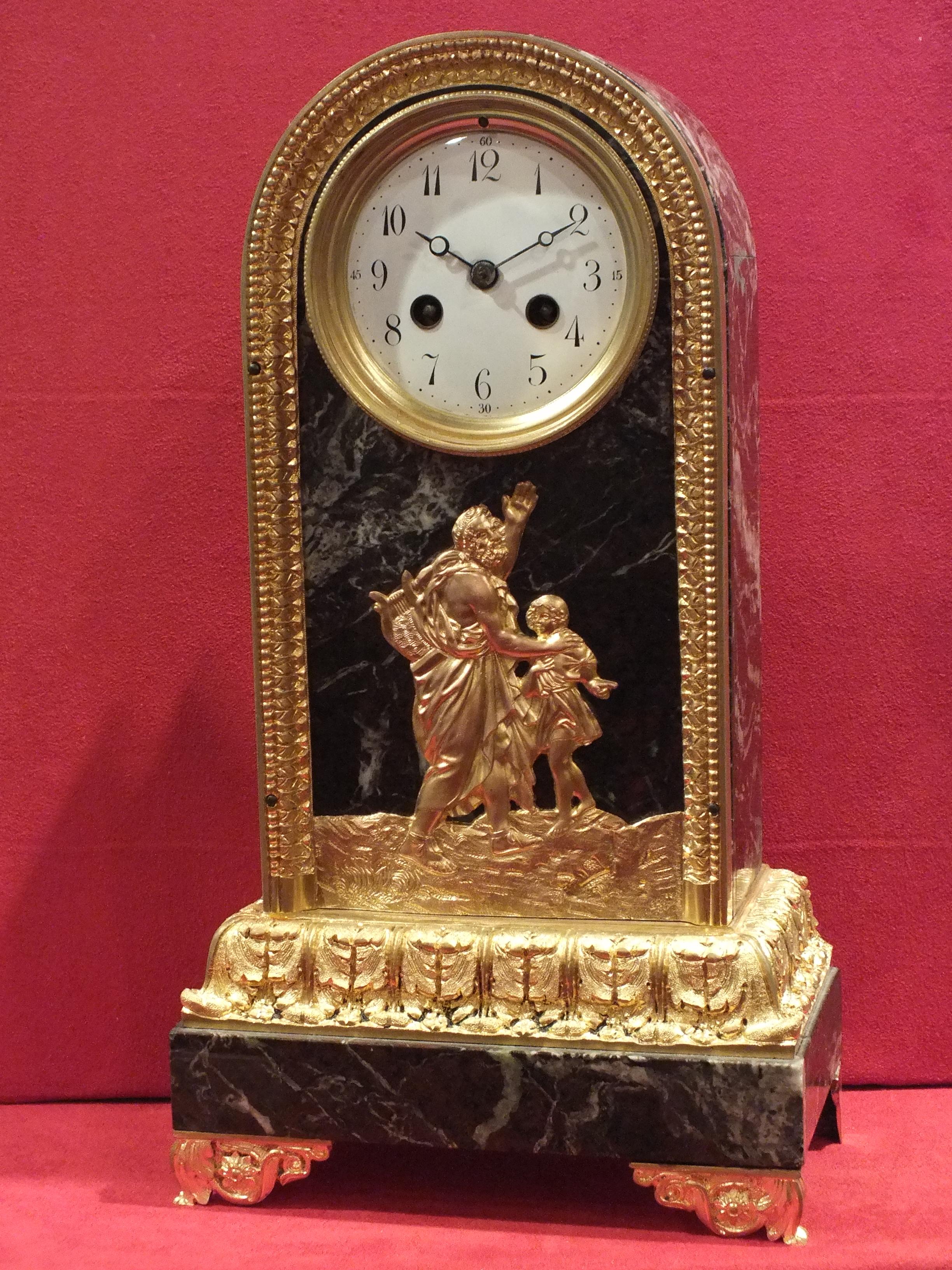 Pendola francese, 1890 circa. In marmo bordeaux con venature bianche e verdi, supportata da piedini fiorati in bronzo dorato. Un drappeggio di foglie d’acanto riprende la luce dei piedini, rilanciandola nella cornice a tema vegetale, nel bassorilievo figurato e nel cerchio. Quadrante in smalto bianco con numeri arabi di ore e minuti, lancette “a occhio” in acciaio brunito. Movimento con suoneria di ore e di mezze su campanello, con carica settimanale; scappamento ad àncora a rinculo, con pendolo posteriore sospeso a lamina d’acciaio.